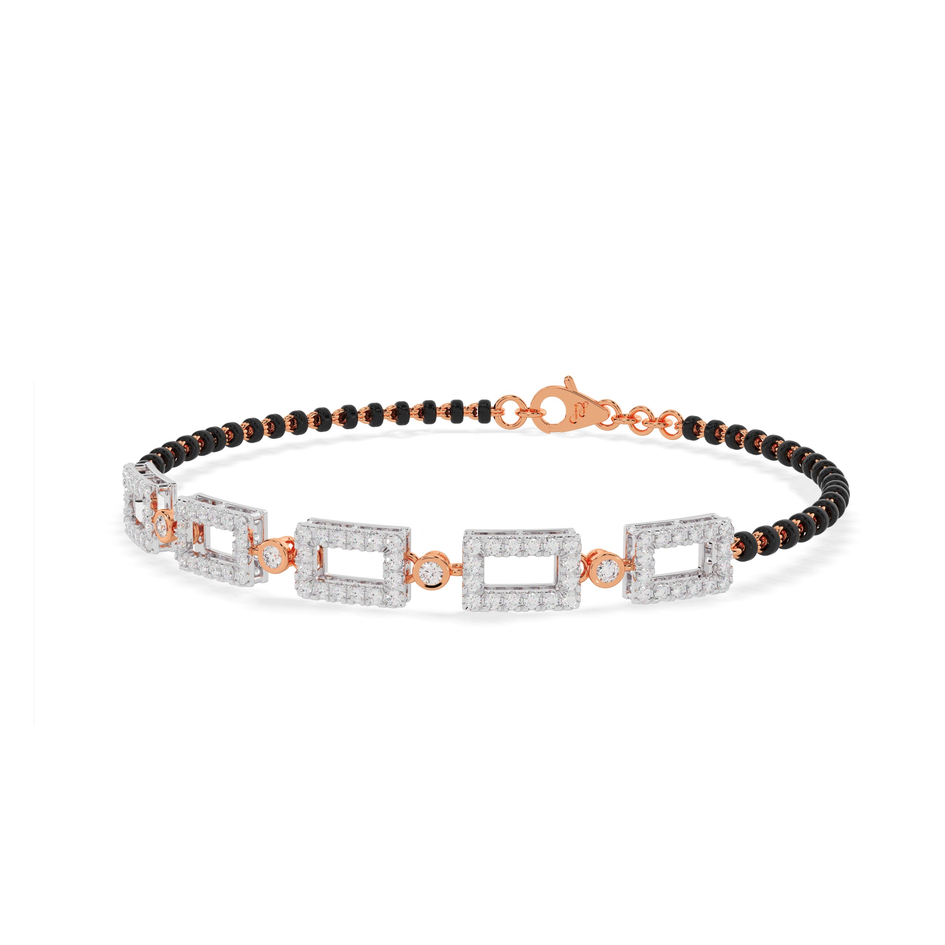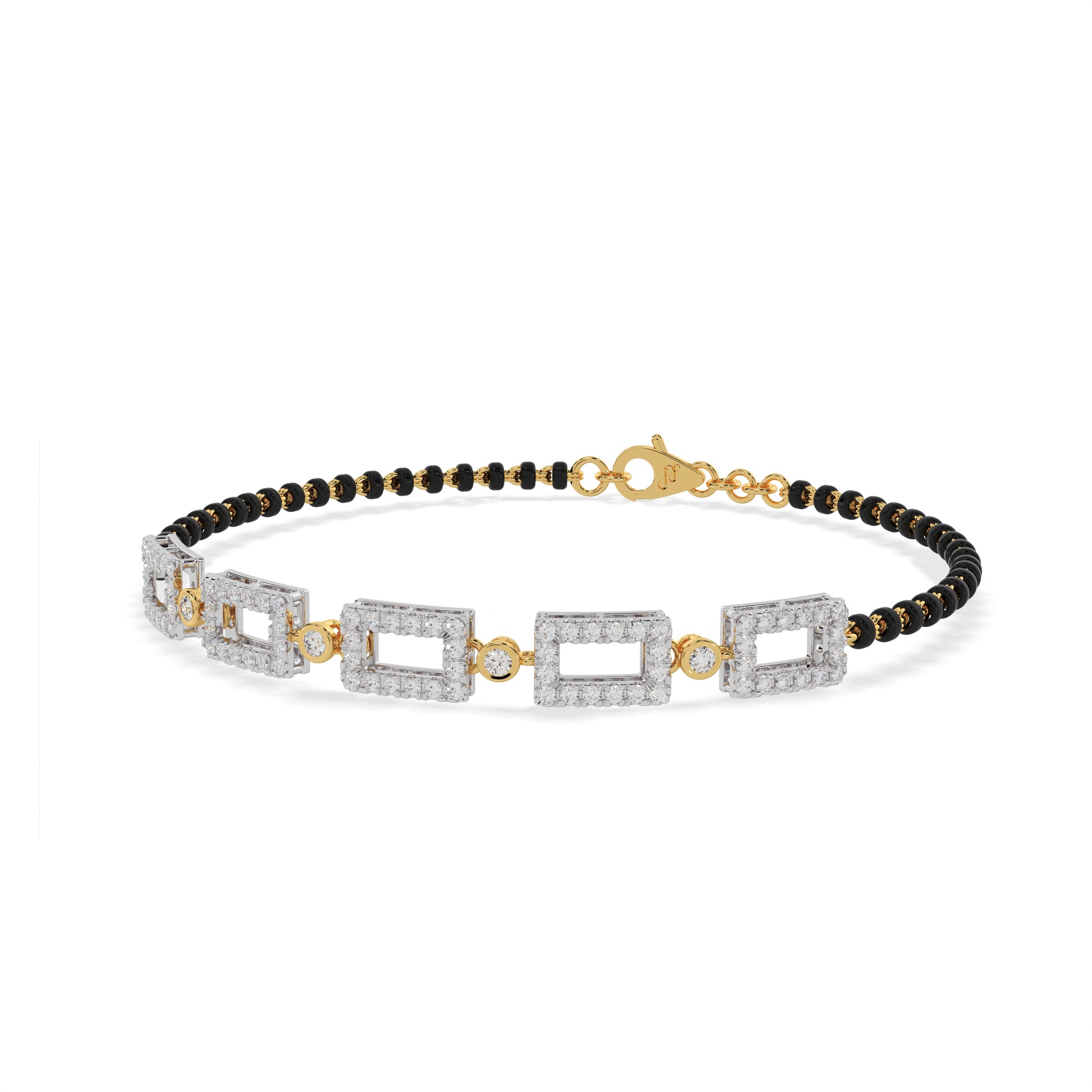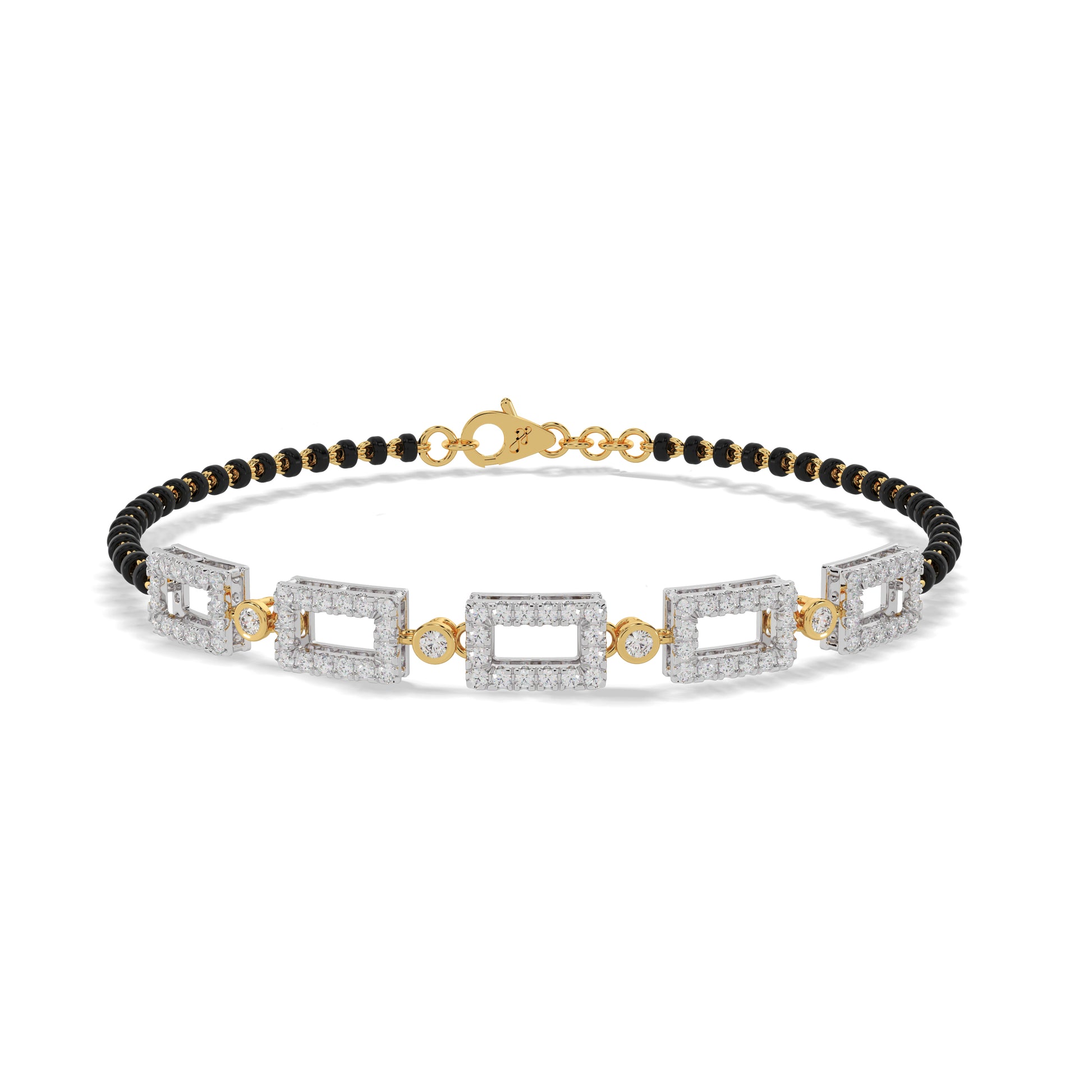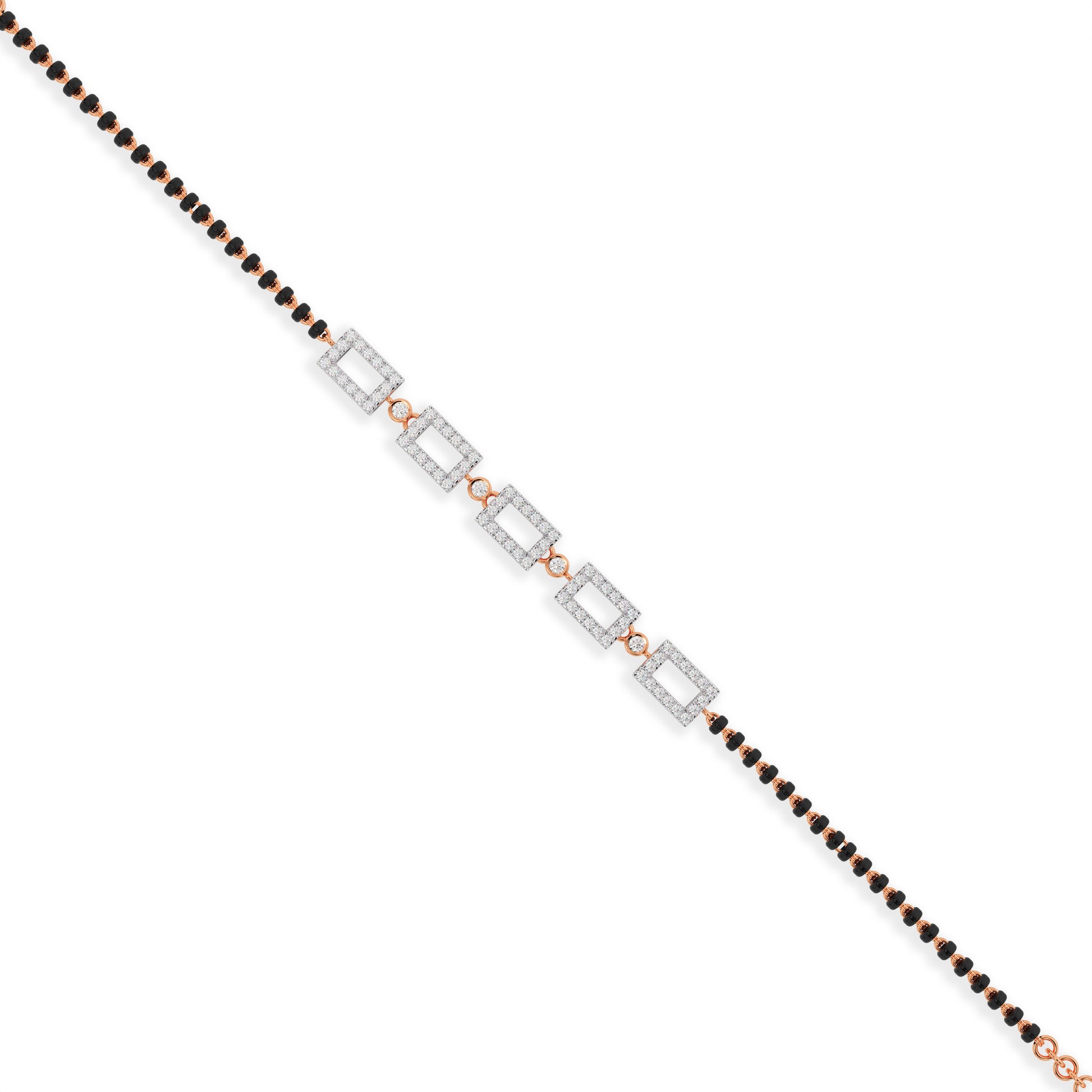 This elegant mangalsutra bracelet features rectangular diamond frames accented with delicate black beads, crafted in radiant 14-carat gold. Available in rose gold, yellow gold, and white gold, it beautifully blends tradition with contemporary design from Jewels & Jawaharat, Chandni Chowk.