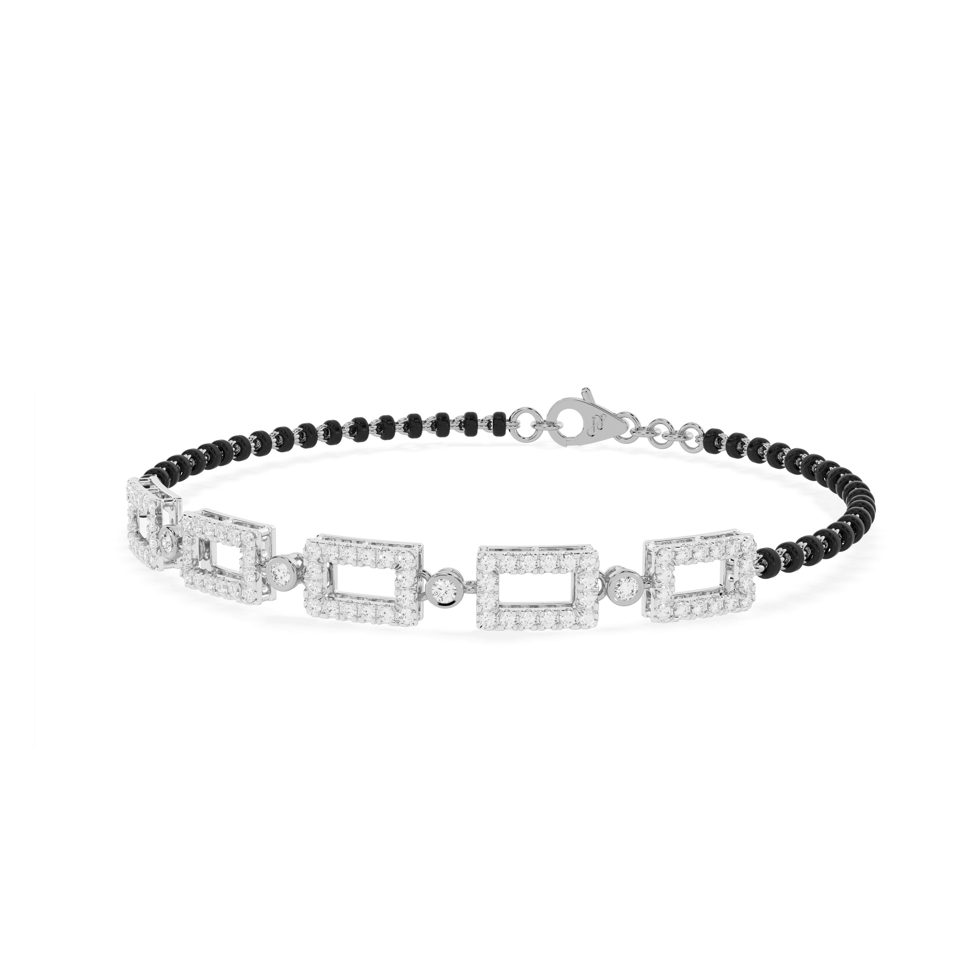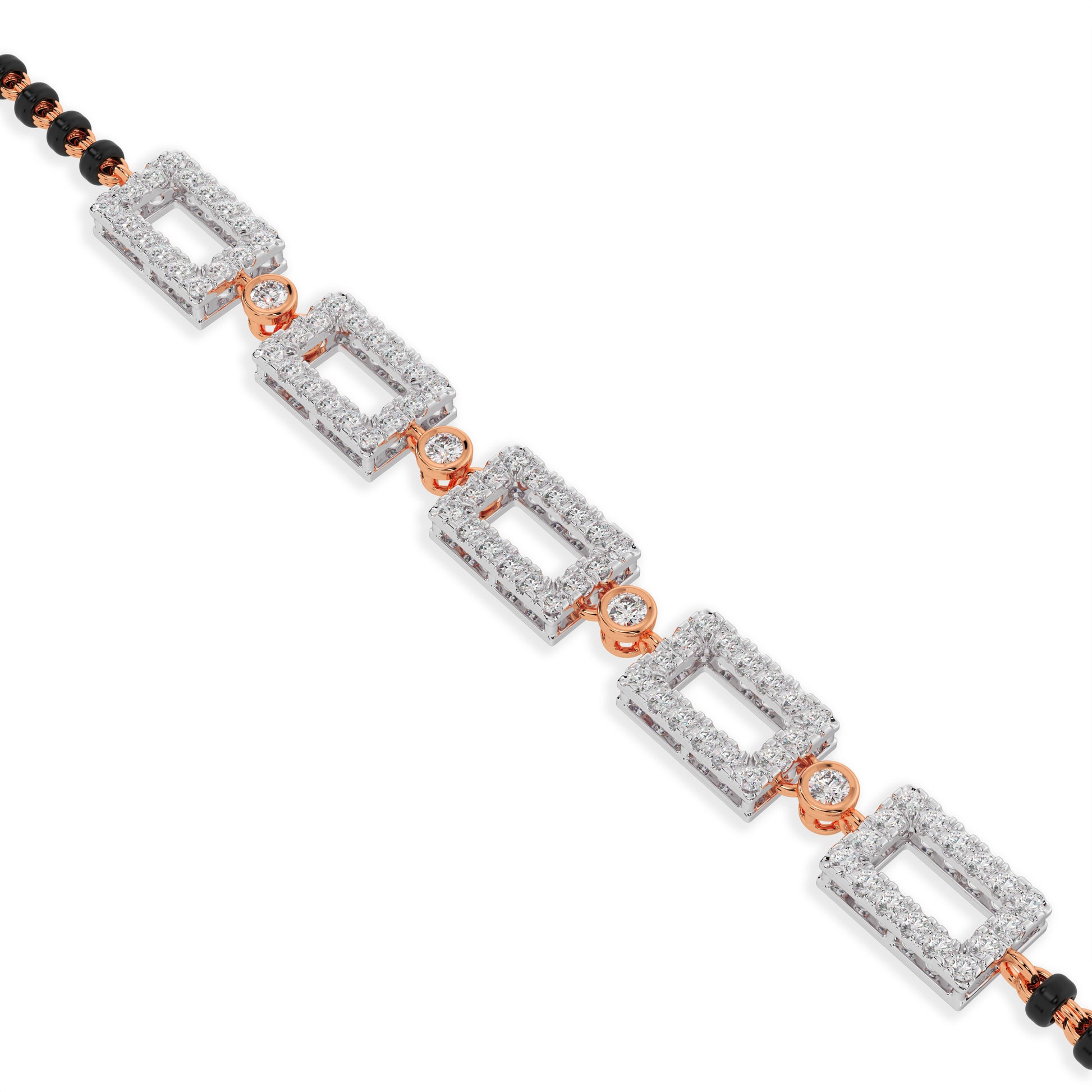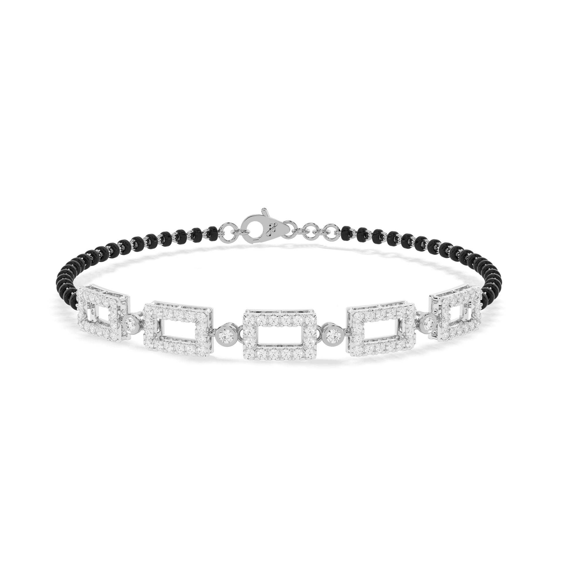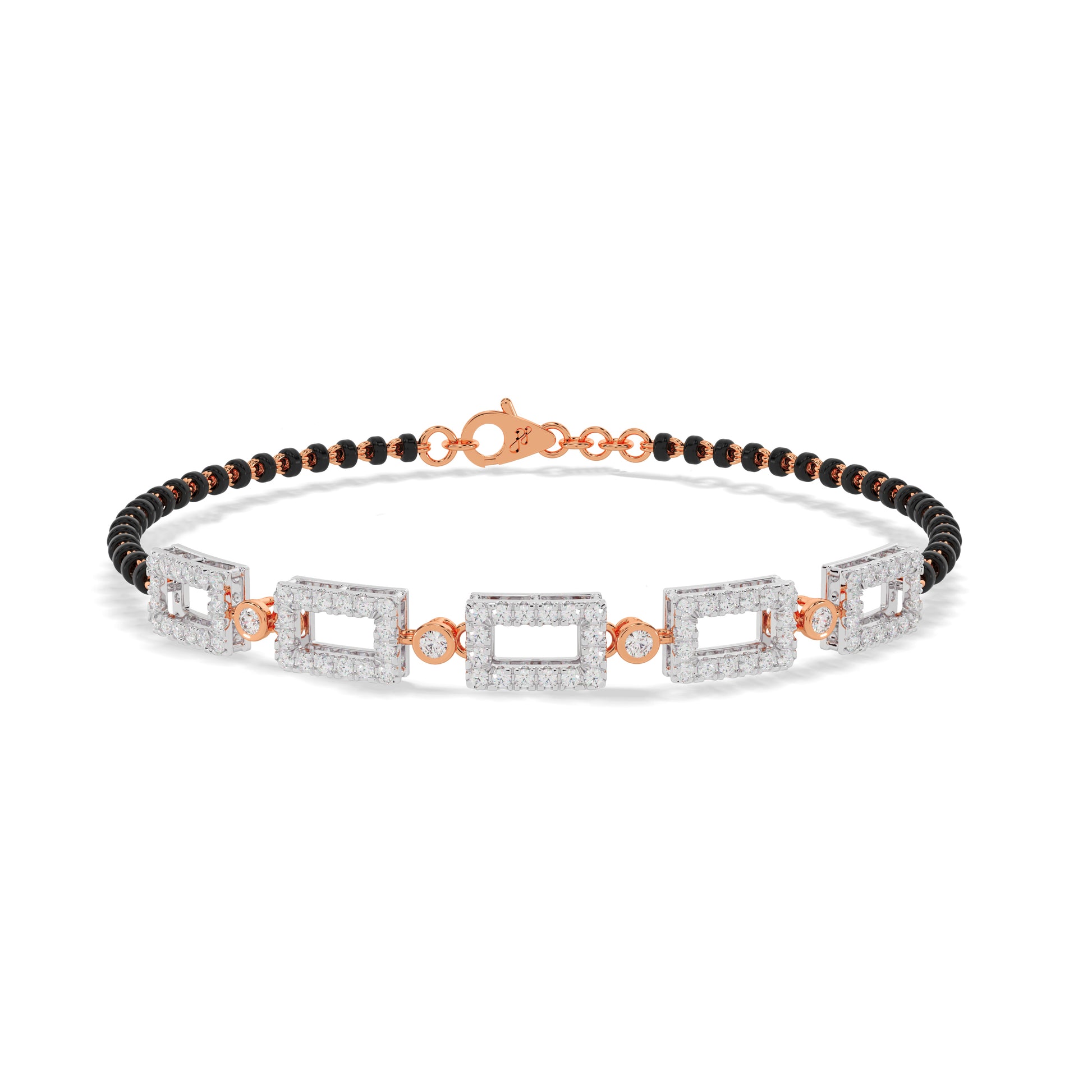 This elegant mangalsutra bracelet features rectangular diamond frames accented with delicate black beads, crafted in radiant 14-carat gold. Available in rose gold, yellow gold, and white gold, it beautifully blends tradition with contemporary design from Jewels & Jawaharat, Chandni Chowk.