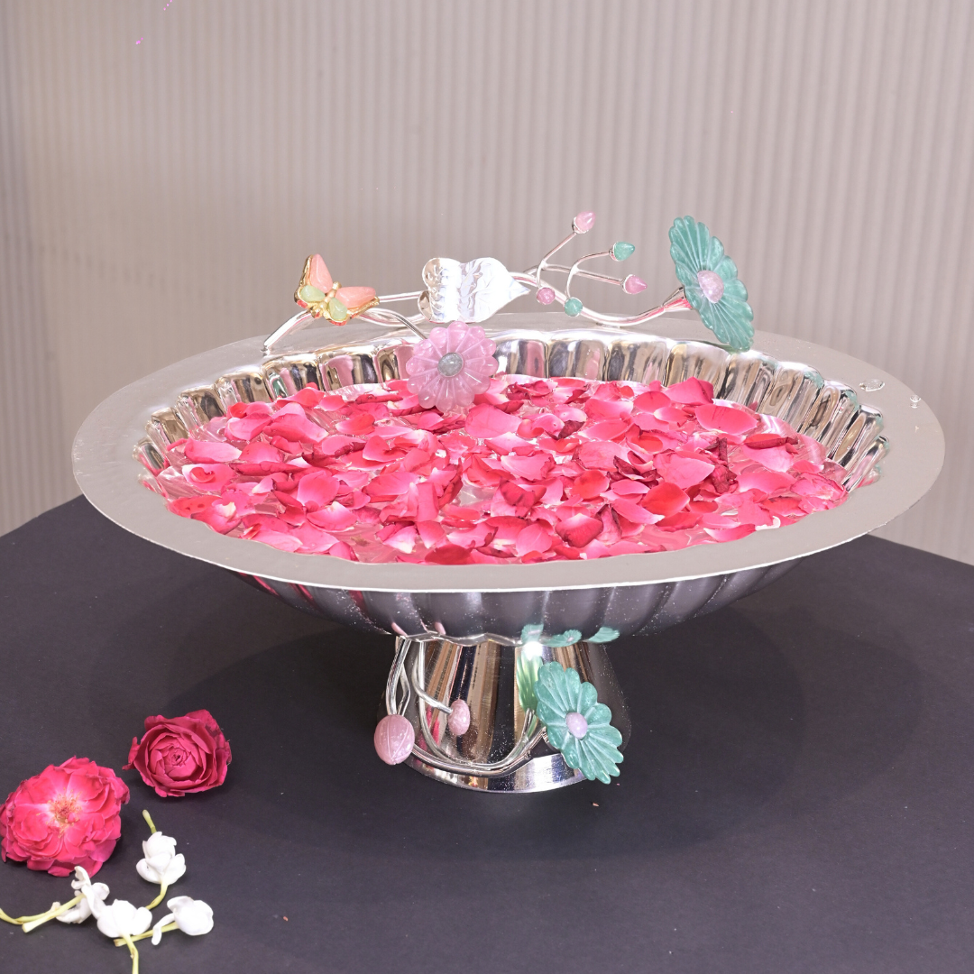 A touch of grandeur and elegance to your festive celebrations with the exquisitely crafted Daisy Big Bowl. With its gleaming silver finish and floral embellishments, this statement piece beautifully blends traditional artistry with modern charm. Perfect as a centerpiece, it enhances your décor while exuding sophistication and grace.