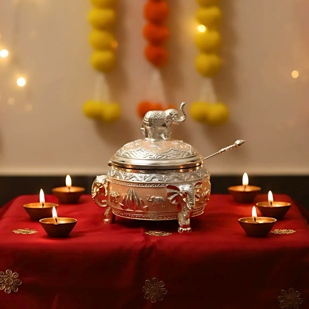 Bring home the grace of tradition with this exquisite silver dry fruit bowl, beautifully designed to reflect timeless artistry. Resting on intricately carved elephant-head legs, this bowl stands as a true symbol of strength, prosperity, and elegance. The lid, crowned with a finely detailed elephant figurine, adds a regal touch while ensuring your dry fruits, sweets, or treats remain fresh and well-stored.