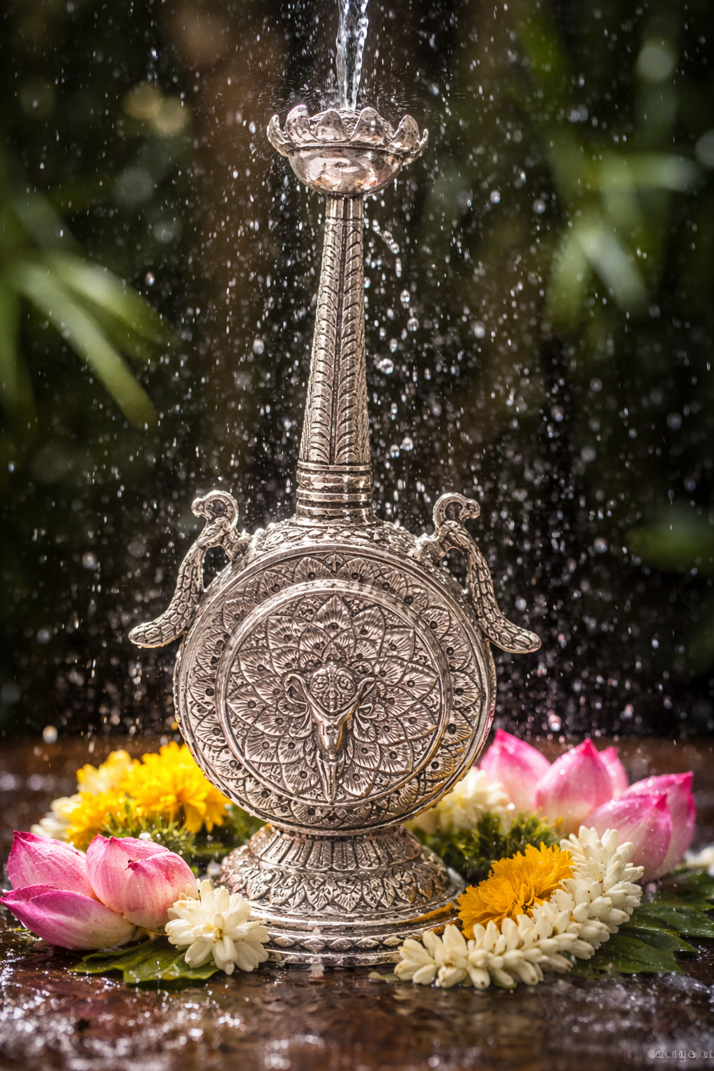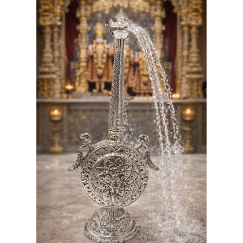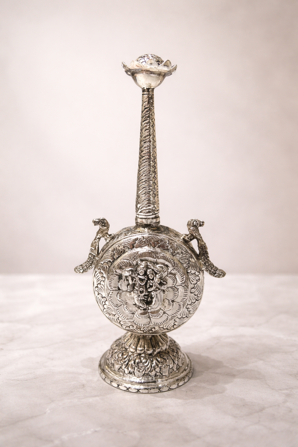 The design features a richly detailed Gulab Pasa adorned with intricate floral and geometric carvings, highlighted by finely sculpted elephant motifs that add a regal and auspicious charm. The elongated, textured neck and sturdy ornamental base enhance its majestic presence. Its elegant and versatile design allows it to be displayed as a soulful centerpiece in your home altar (pooja room), living area, or as a meaningful gift for auspicious occasions, festivals, and spiritual milestones, infusing your space with the enchanting beauty of Indian traditions.