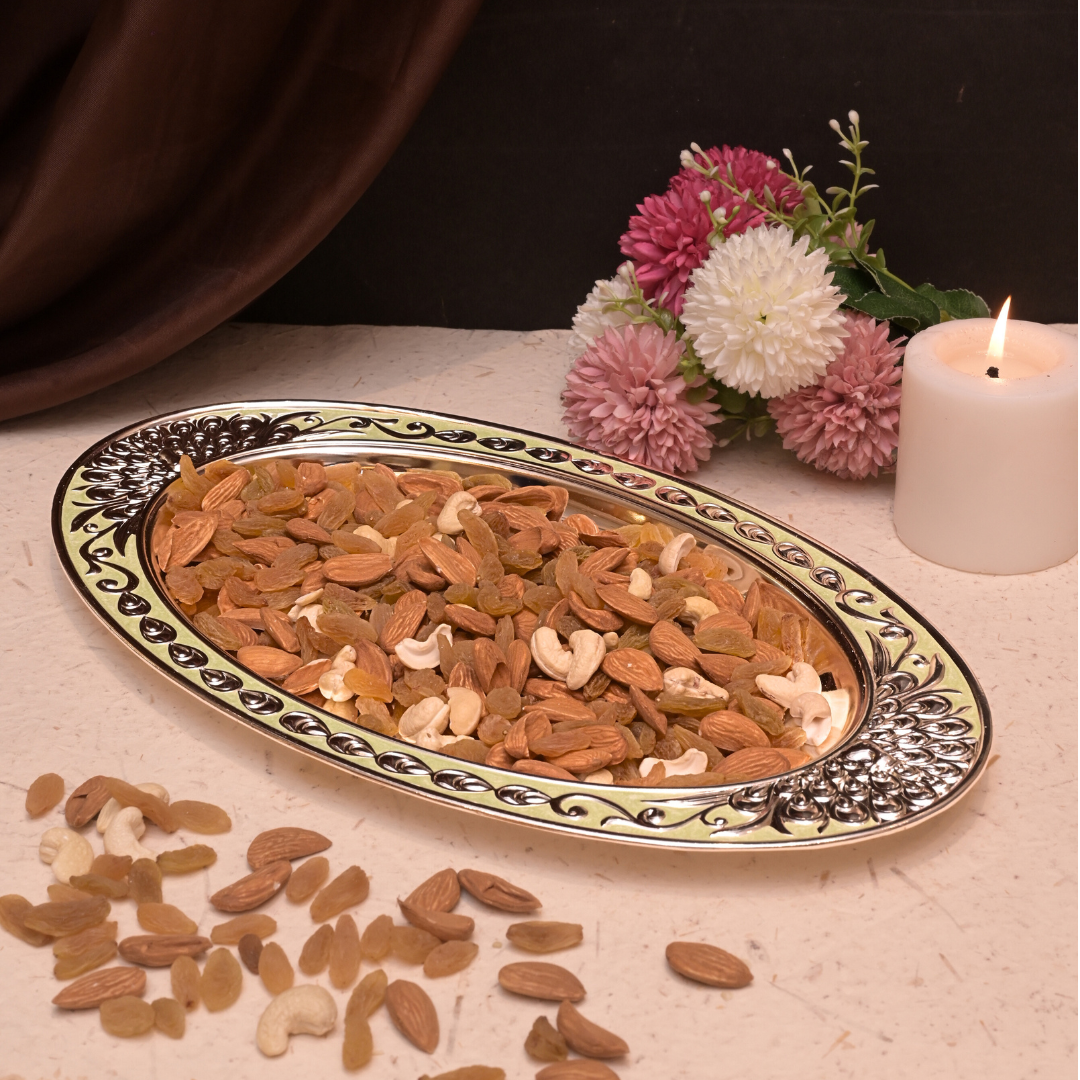 Ideal for serving dry fruits, sweets, or beverages, it also makes a perfect silver gifting piece for weddings, housewarmings, and festive occasions. Its sleek oval shape and glossy enamel surface make it both functional and decorative — a timeless expression of refined taste and style.