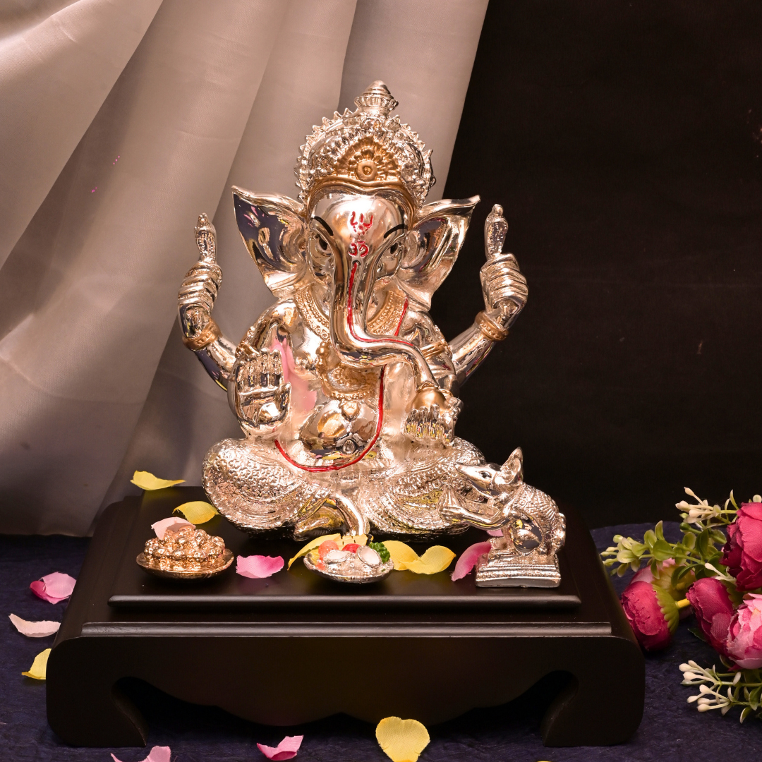 A timeless expression of faith and devotion, this silver-plated Ganesh idol is a perfect choice for weddings, housewarmings, Diwali, and other spiritual celebrations—blending sacred tradition with everlasting elegance.