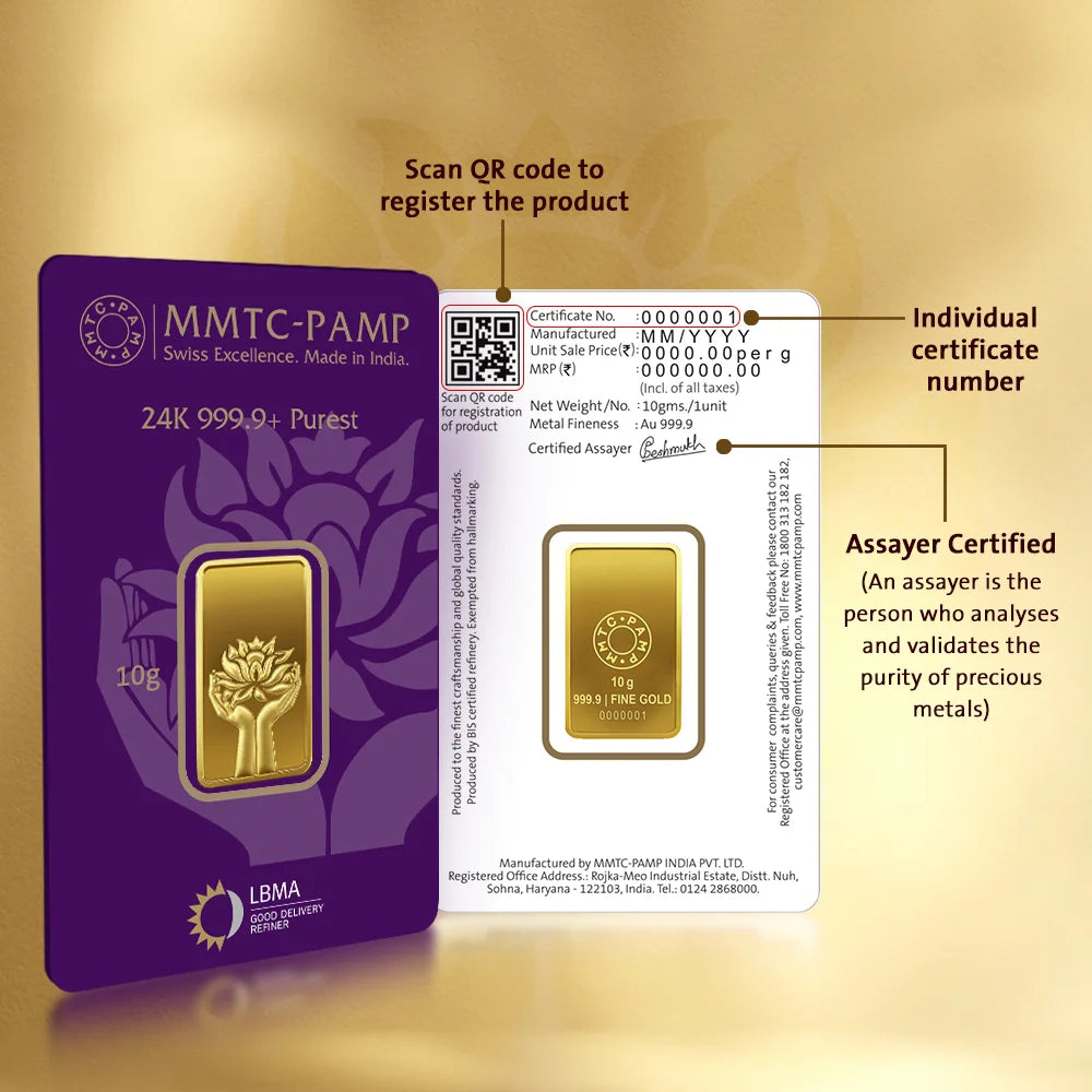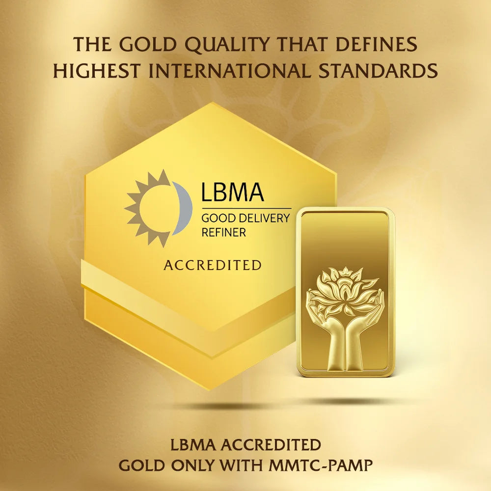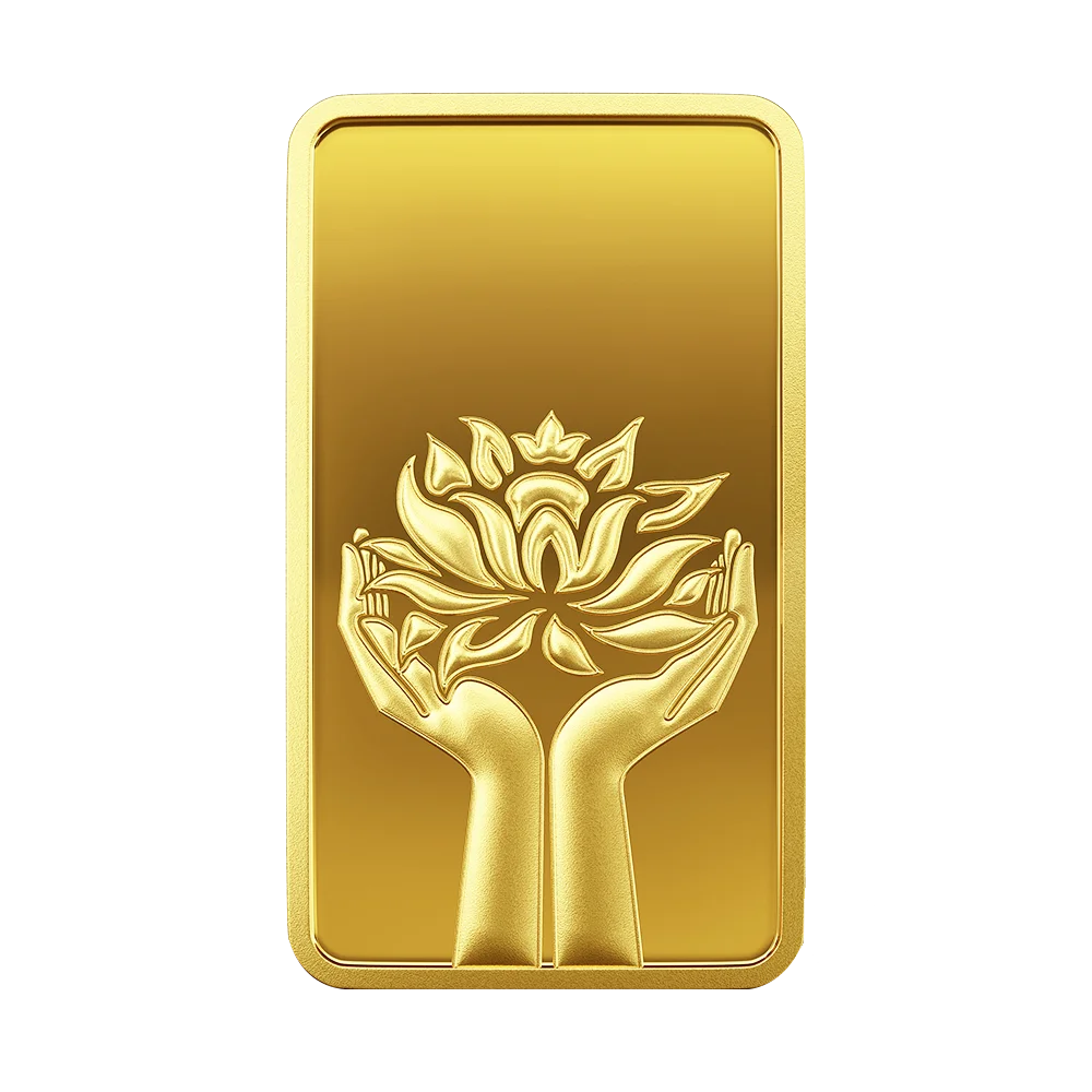 The lotus flower, which is exquisitely depicted on our pure gold bar, is a symbol of long life, honor, prosperity, victory, and mental and emotional purity. The recognizable Lotus motif of MMTC-PAMP India features two hands clutching a Lotus flower. This iconic design embodies the quality and authenticity promise of MMTC-PAMP India with its unmatched finish, excellent aesthetics, and clean lines. The 999.9 finest gold and silver ingots and coins that MMTC-PAMP mints are proud of their distinctively symbolic motifs and designs. The lotus flower has particular meaning in Hinduism. For instance, in Hindu mythology, Lord Vishnu (the Preserver) is represented as Padmanabha, and on his navel, a lotus blossoms with the image of Brahma (the Creator) on it.