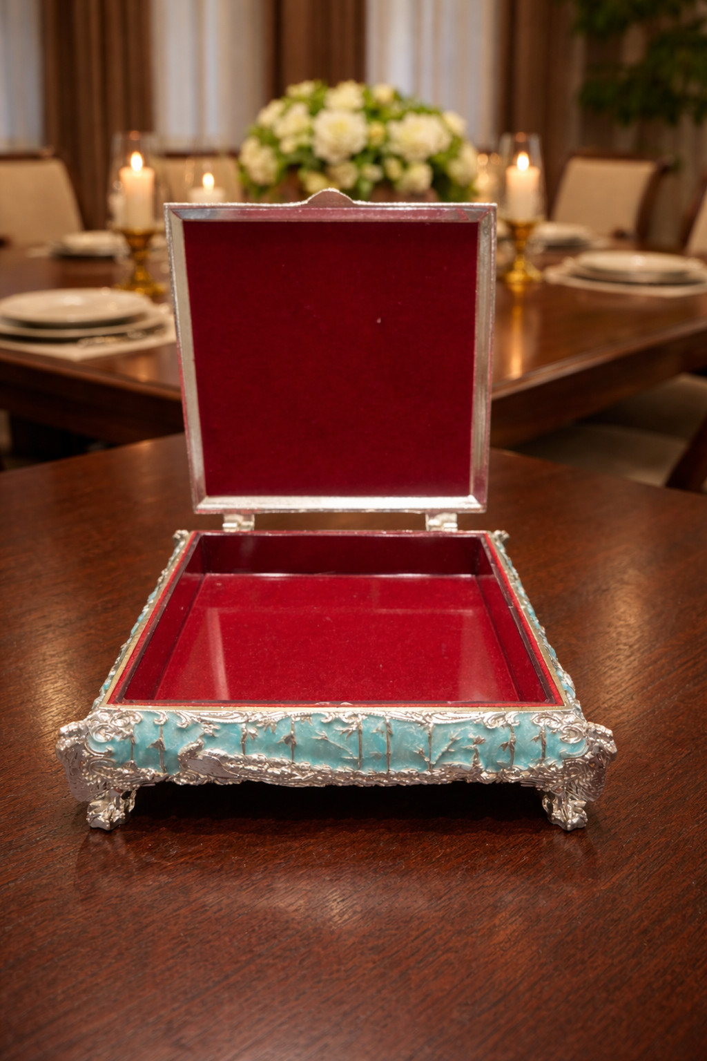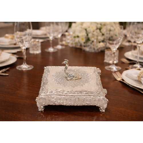Elevate your gifting and home décor with this exquisitely crafted Peacock Flat Dry Fruit Box. In Green and Peach, the closed box features a magnificent, intricately designed silver peacock motif as its centerpiece, set against a stunning, vibrant lime-green enamel background. This regal design instantly captures attention, symbolizing grace, beauty, and prosperity. The silver-finished base and ornate feet add a touch of timeless luxury, making it a perfect statement piece.