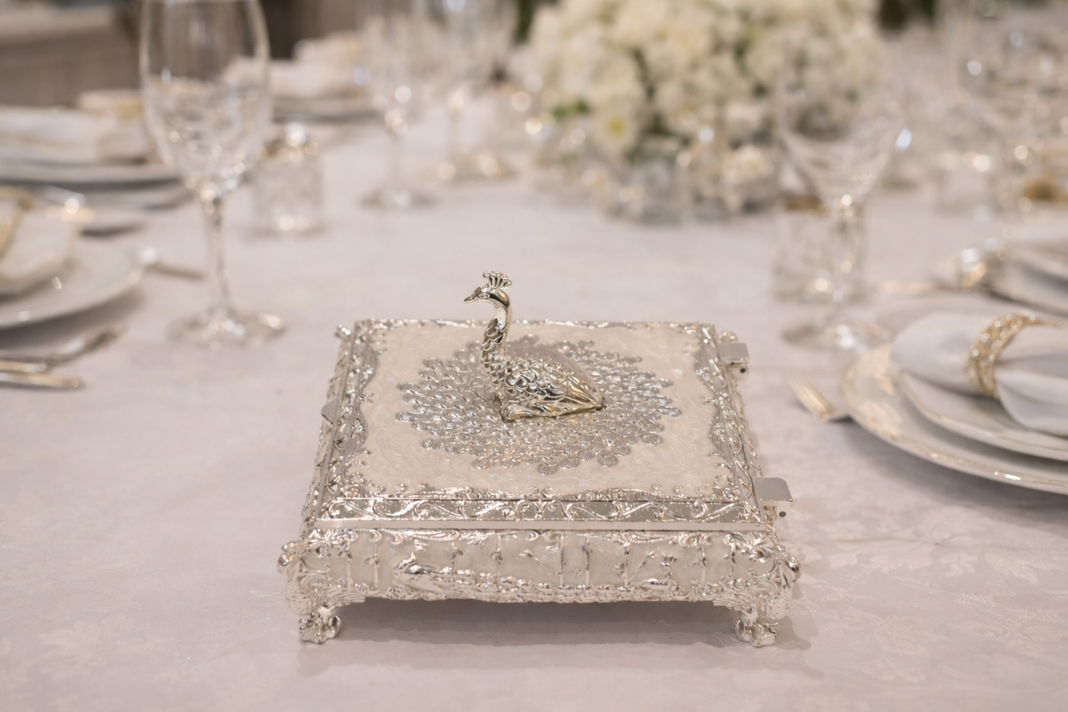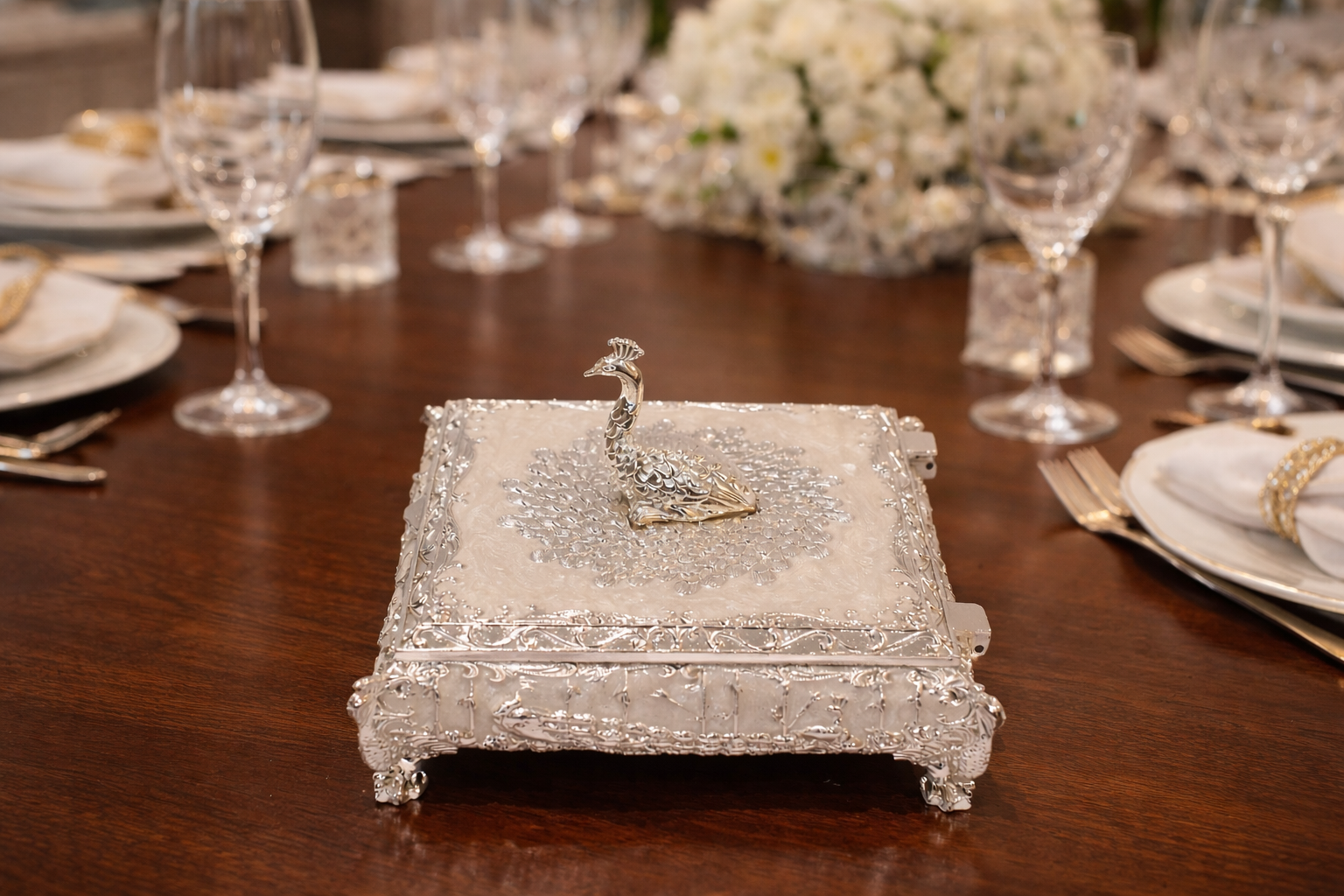 Design: Flat, Square Box with a Prominent Silver Peacock Motif on a Lime-Green Enameled Lid. Ornate Silver Finish and Four Divided Sections.