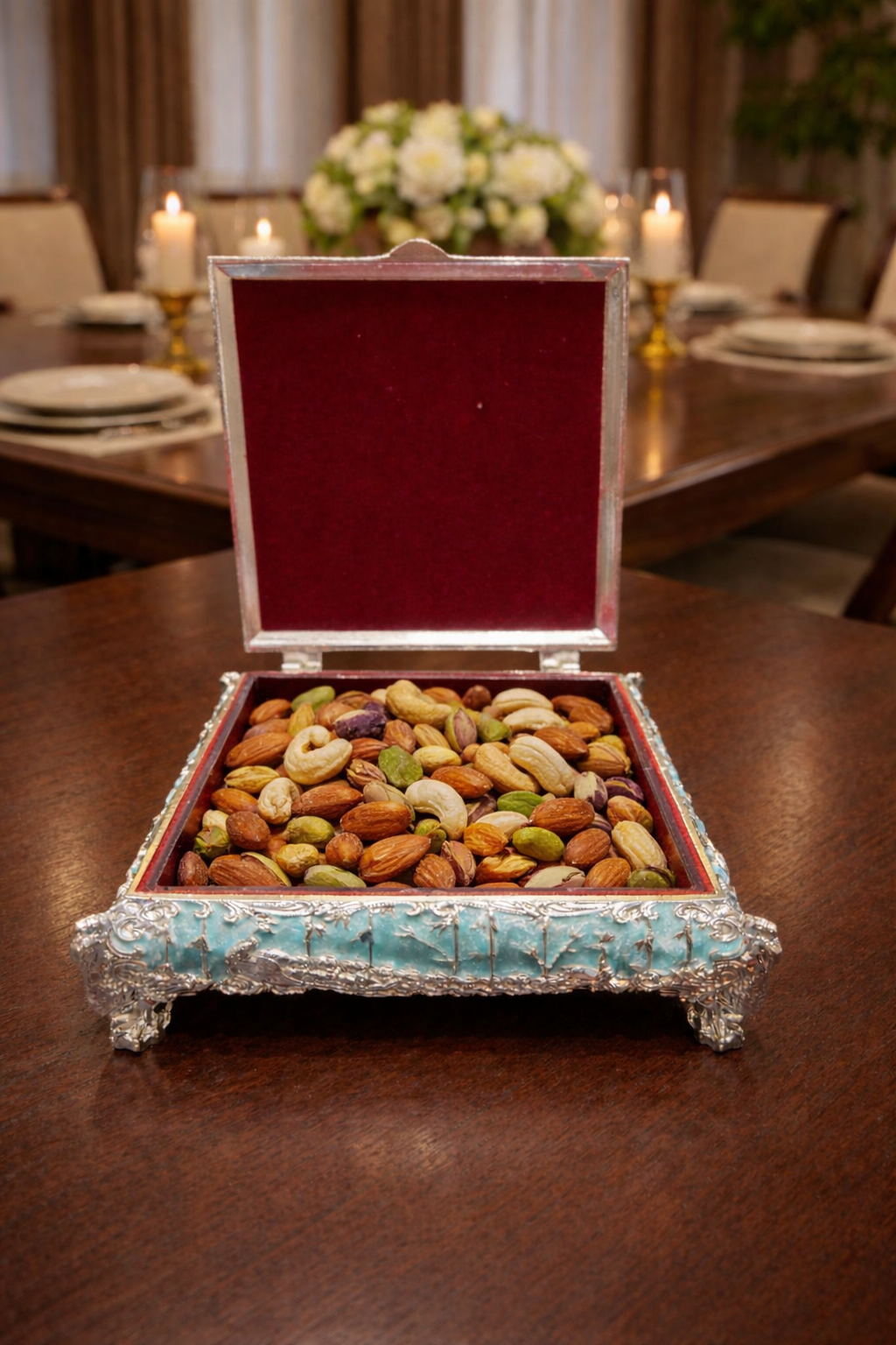 Opening the box reveals a sophisticated velvet-lined lid and four neatly divided compartments, perfect for presenting an assortment of dry fruits, nuts, or sweets. This DFB is more than a container; it is an heirloom-quality piece that blends functionality with opulent artistry.