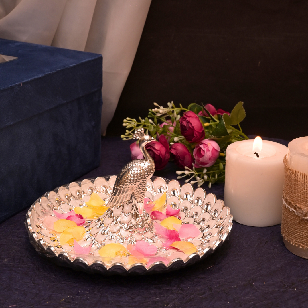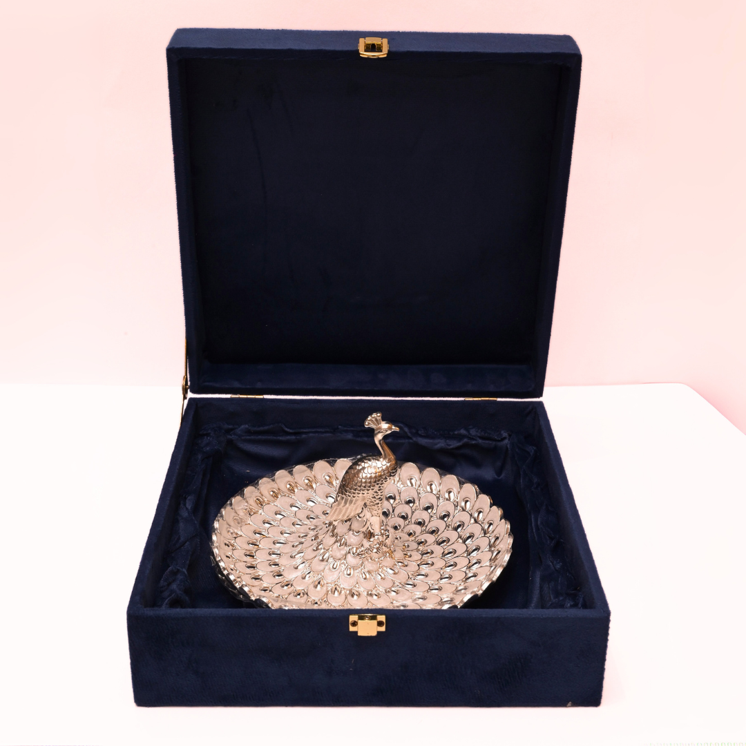 Elevate your home décor and gifting with this exquisite Silver Plated Peacock Platter. This stunning piece features a magnificent, intricately detailed silver peacock as its centerpiece, majestically standing within a beautifully scalloped platter designed to evoke peacock feathers. The high-polish silver finish radiates timeless luxury and grace, symbolizing beauty, prosperity, and auspiciousness. The delicate craftsmanship and thoughtful design make it a captivating statement piece.