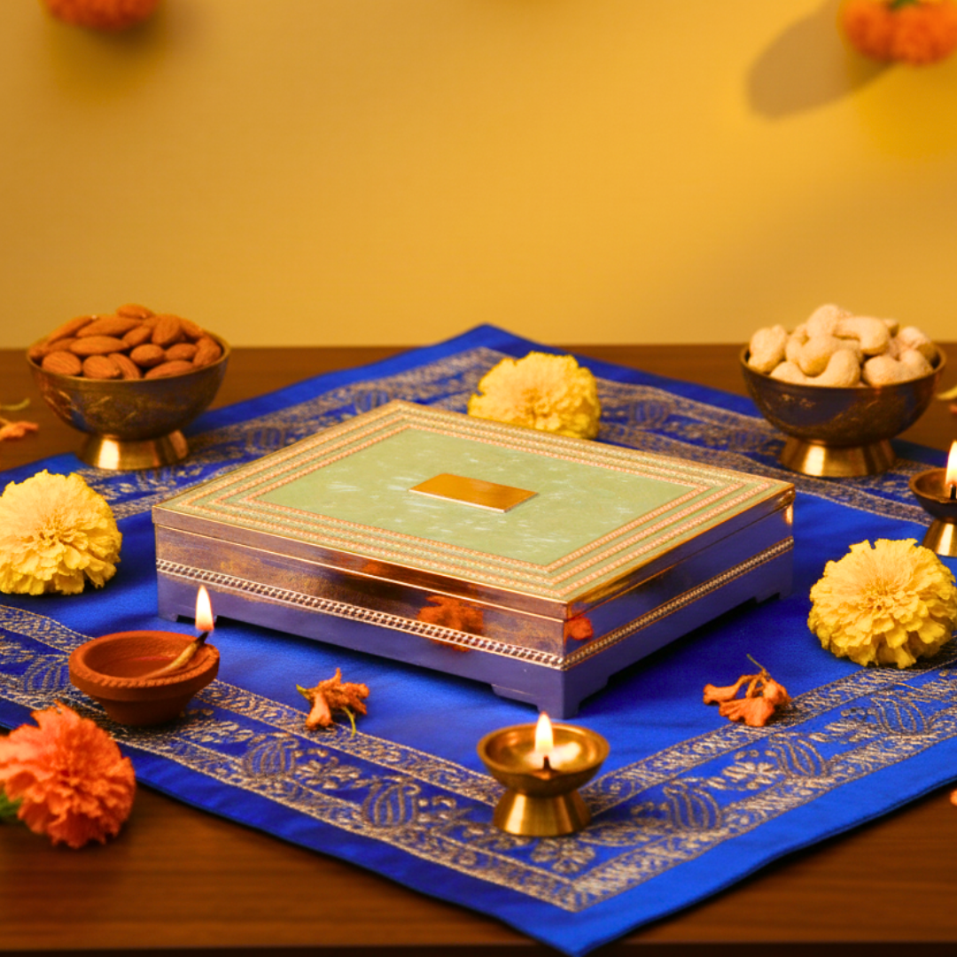 Crafted from Premium Metal Alloy with Gold Plating (Body & Accents) and a smooth Stone-like Resin/Inlay (Lid Panel), this box is ideal for storing and serving dry fruits, sweets, or festive offerings. It serves as an exquisite Gifting item for weddings, housewarmings, or festive celebrations like Diwali, adding a touch of luxurious charm to home or event décor.