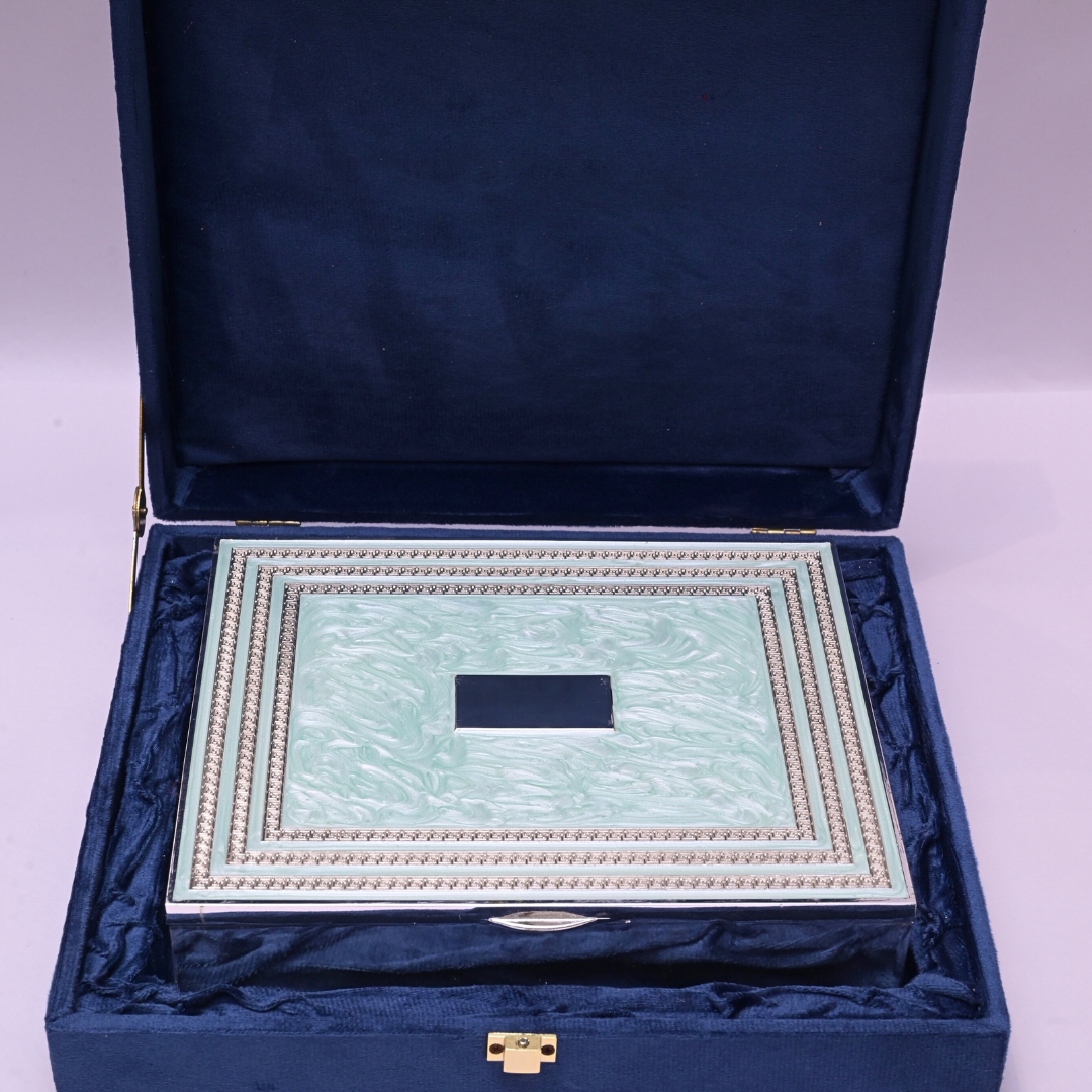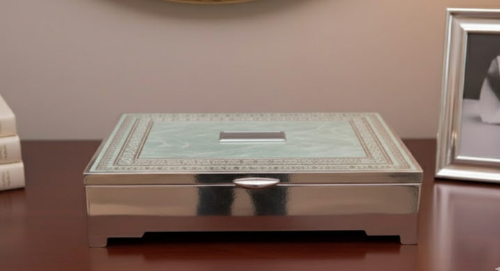 ✨ Design: Rectangular, Gold-Plated Box with a Luxurious Mint Green Stone-like Lid and Intricate Gold Accents.