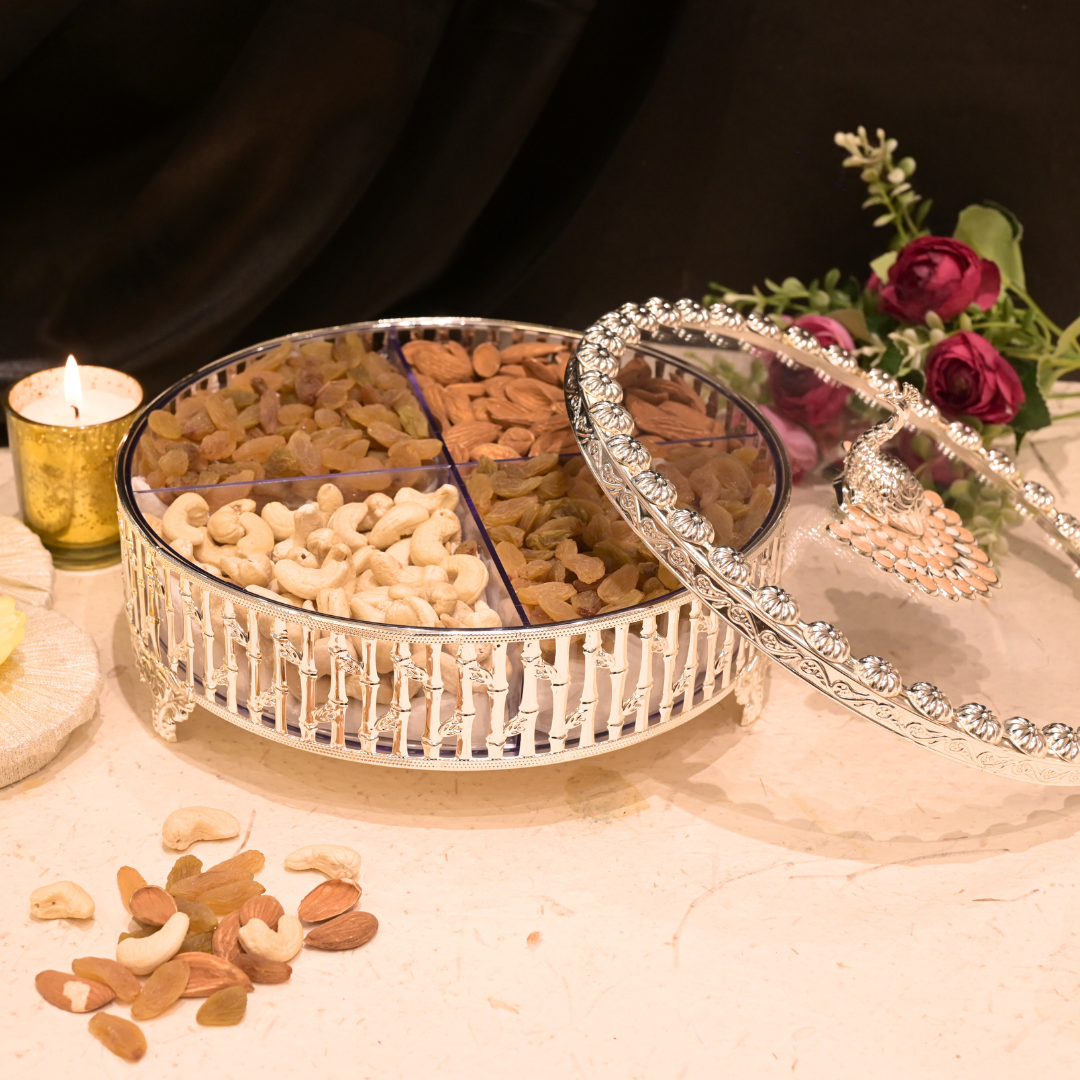 Add a royal charm to your celebrations with this exquisitely designed silver-plated round box. Featuring a transparent lid with an elegant peacock handle and intricate side detailing, it is perfect for storing and serving dry fruits, sweets, or snacks.