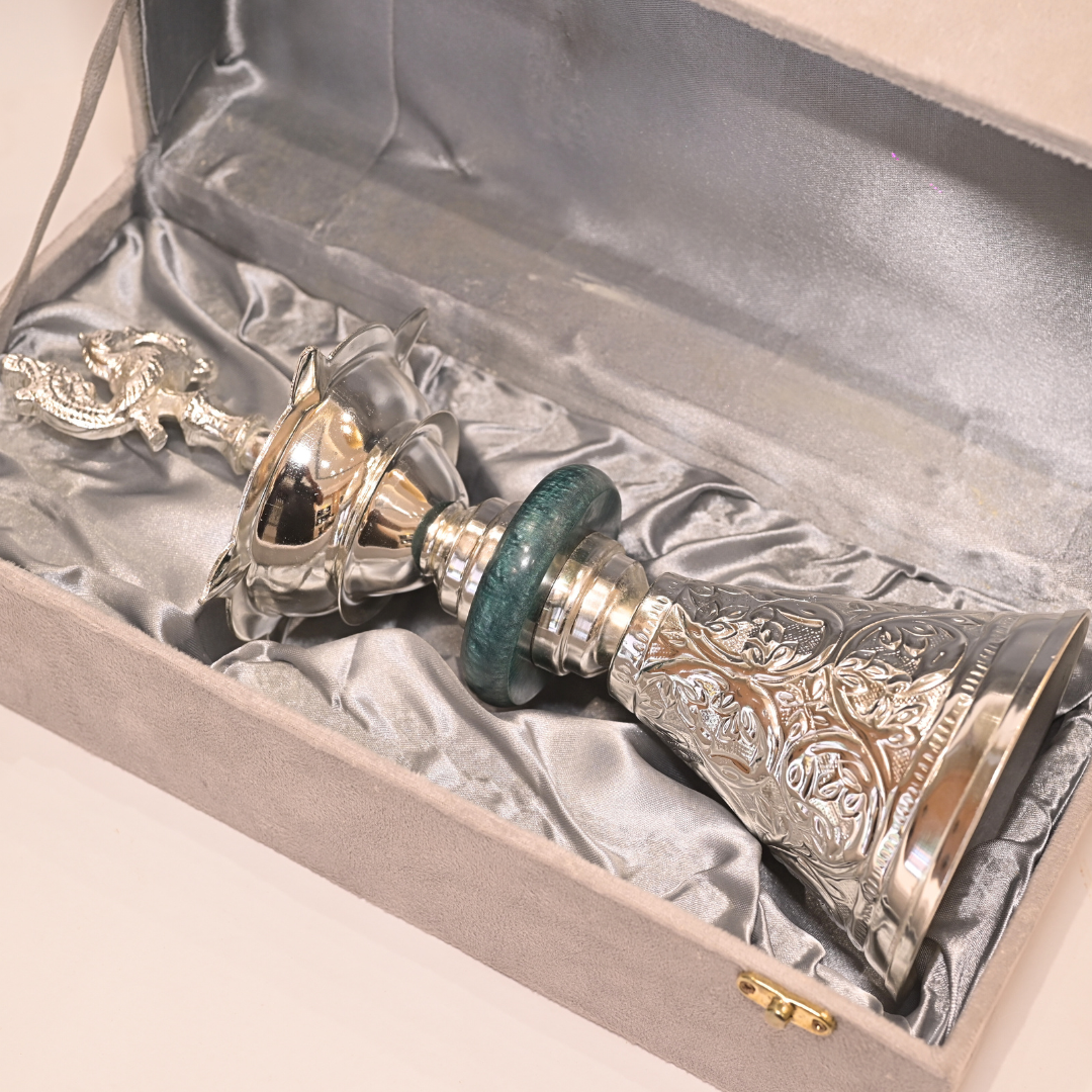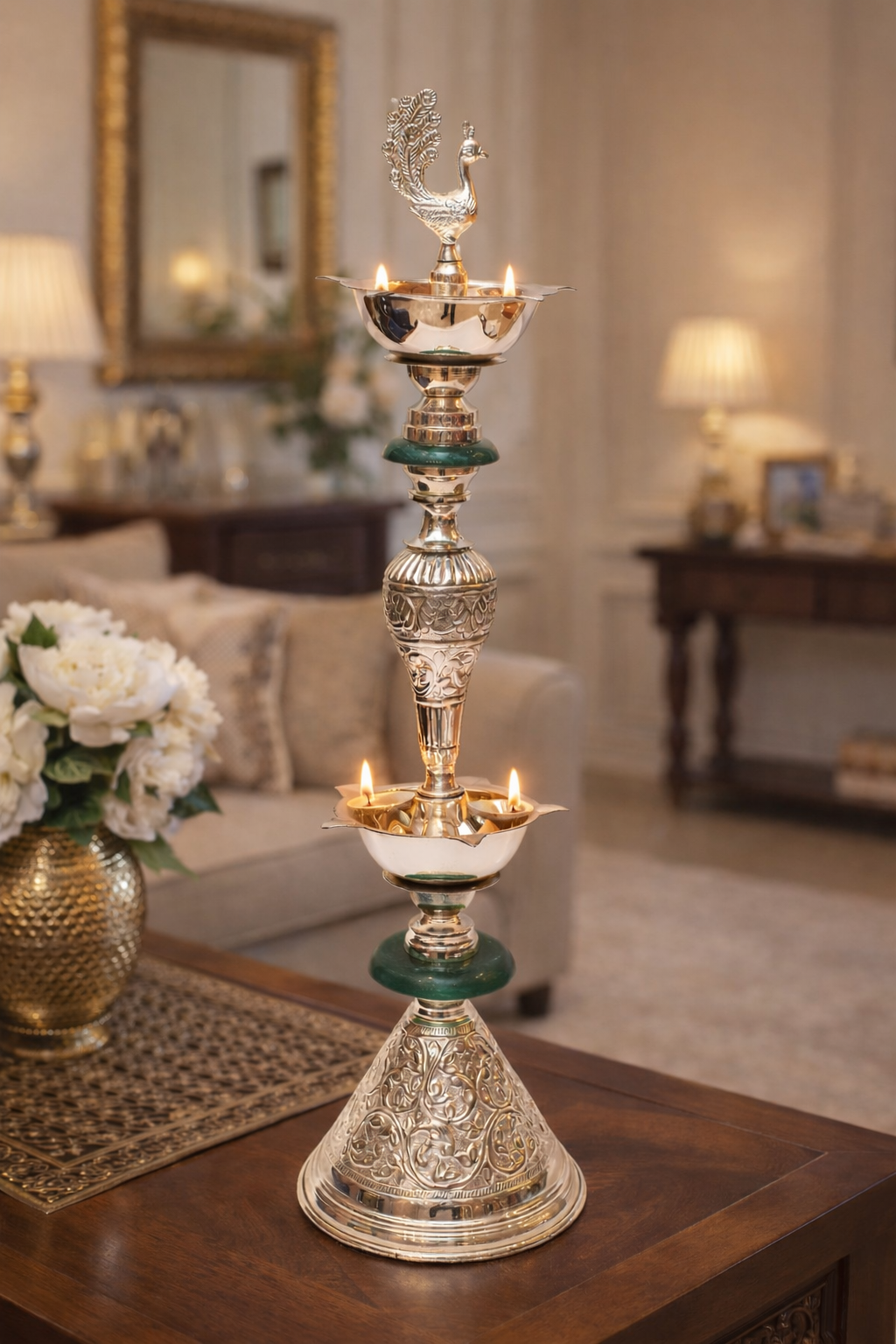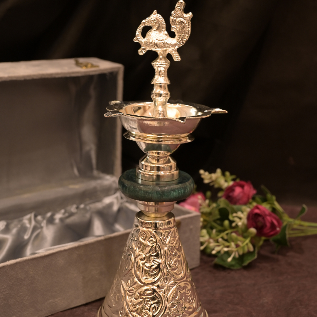 Elevate your traditional rituals with this exquisitely crafted silver finish lamp. Designed with intricate engravings and a graceful bird motif on the top, it symbolizes prosperity and divine blessings. The sturdy base and elegant detailing make it a perfect addition for puja ceremonies, festive occasions, or as a meaningful gift.