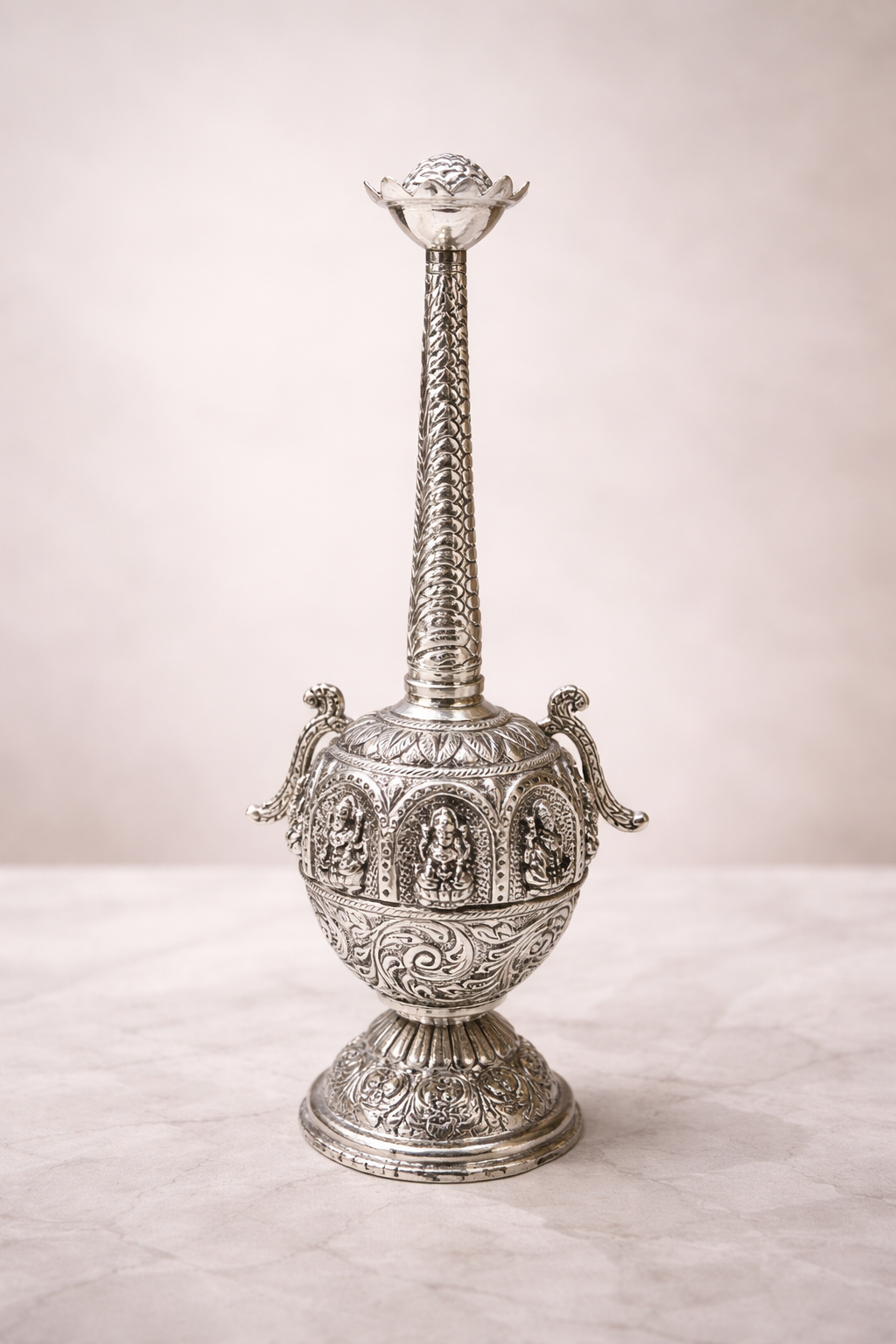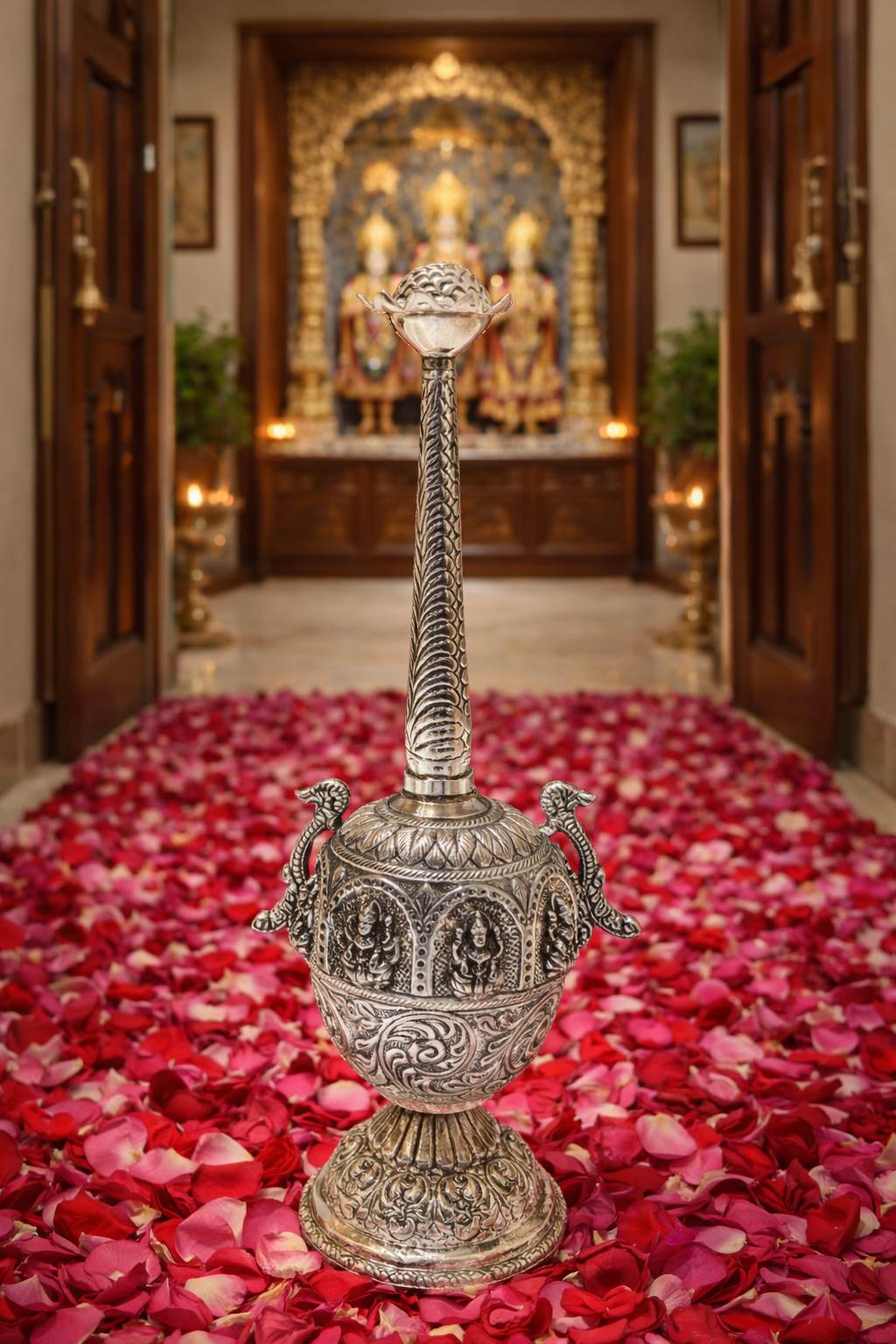 The design features a richly ornamented Gulab Pasa adorned with intricate floral engravings and delicately sculpted deity motifs, symbolizing enlightenment and devotion. Elegant peacock-inspired side handles and a finely textured elongated stem add to its majestic appeal. Its balanced and versatile design makes it ideal for display in your home altar (pooja room), study area, meditation space, or as a meaningful and auspicious gift for students, educators, and spiritual occasions, radiating the serene beauty of Indian traditions.