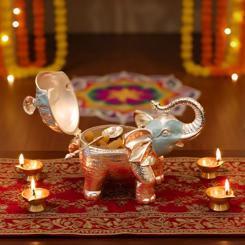 Crafted from premium silver, this stunning elephant-shaped box is more than just a decorative accent—it's a functional masterpiece. The body features a brilliant, highly polished silver finish, contrasting beautifully with the serene, hand-painted enamel detailing in a delicate blue-green hue on the head and back. The top section opens up like a treasure chest, revealing a spacious, polished interior perfect for storing dry fruits, sweets, or trinkets. It comes complete with a small, matching silver spoon for serving. Symbolizing strength, wisdom, and good fortune, this piece makes a magnificent and memorable gift for housewarmings, festivals like Diwali, or any special occasion, bringing a touch of regal elegance to your home decor.